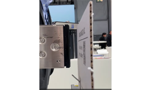 今回のdrupaでは強化事業の一つであるインダストリー事業からも出展、コニカミノルタ独自技術である薄膜IJヘッドによるハイギャップ印刷のデモを行いました。通常のヘッドでは印刷対象物との距離は1~3mmとされますが、当社のKM800H-MRでは最大20mmというハイギャップ印刷を実現、実際に段ボール搬送工程を模した動態展示を実施し、高い印字品質に対して多くのプリンターメーカーから好評価をいただきました。