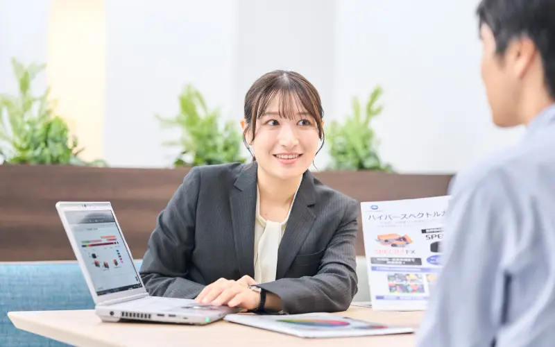 2年目にコニカミノルタジャパンに出向。今はセンシング製品の営業活動に従事しています。光や物の色を測るセンシング製品は、自動車外観の品質管理や化粧品の機能評価、ディスプレイの品質管理など、幅広い業種で重宝されています。営業先は、そうしたエンドユーザー様や、エンドユーザー様との間を取り持つ商社様が中心です。私は大阪エリアを担当し、PR活動やデモ商談、購入後のフォロー活動を行っています。