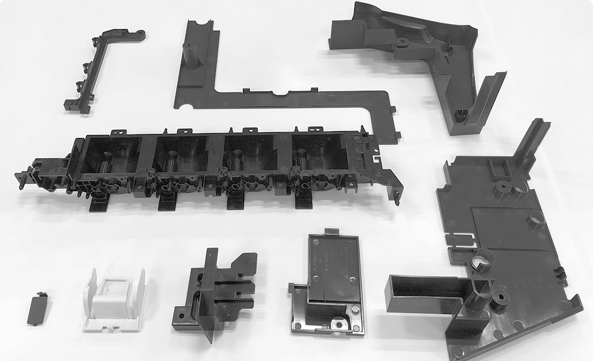 R-ABS, a recycled plastic made from the interior components of gaming machines, is used in the paper tray, which is an interior component of MFPs. R-ABS can reduce CO2 emissions by up to 80% compared to virgin plastic. Large components with a number of ribs (protrusions) are more difficult to mold, but Konica Minolta's products contain a wide range of small and large components.