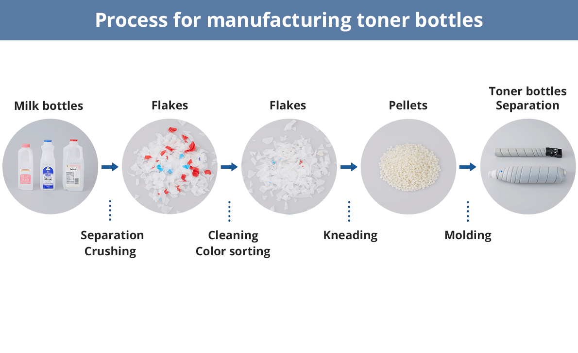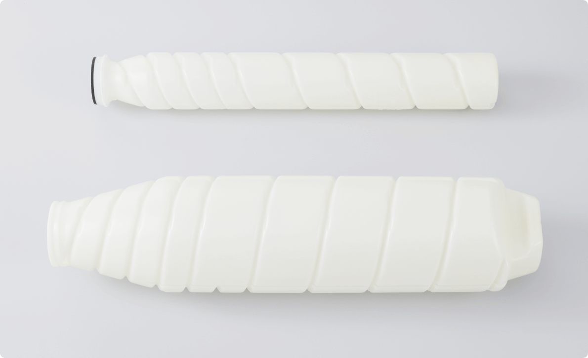 R-HDPE is a recycled plastic made from milk bottles, which are also a problem in terms of marine pollution. R-HDPE is used in toner bottles, which are a consumable for MFPs. The ratio of PCR material in R-HDPE is 100%, which reduces CO2 emissions by 50% compared to virgin plastic, while its quality is on par with that of virgin plastic.